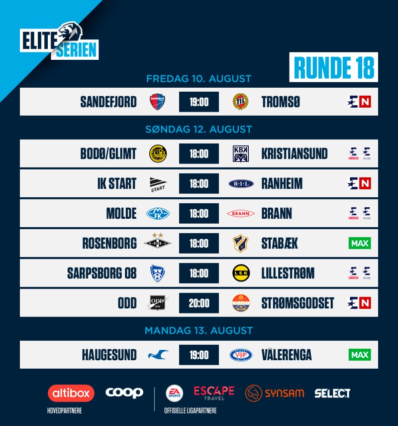 Det er klart for runde 18 av Eliteserien 2018!